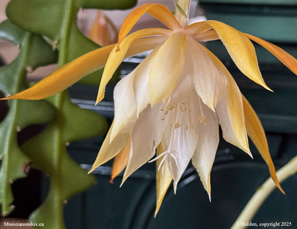 Surprise! My fishbone cactus (AKA Zig Zag plant) flowered! It stealthily put out 6 buds, all at the same time, and within a few days the buds transformed to large yellow blooms. They exuded an exotic scent at night, flowered for exactly one day, and then wilted. They are apparently related to Christmas Cacti and like the same treatment: to be outdoors all summer in a shady spot, almost completely neglected until moments before the first frost, when they are hastily brought back indoors..